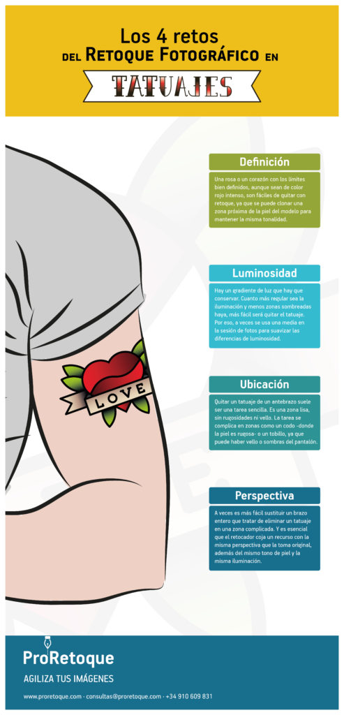 Esta infografía muestra los 4 retos a los que se enfrenta un retocador a la hora de ocultar un tatuaje. La definición, la luminosidad, la ubicación y la perspectiva determinan la dificultad del retoque, que depende del tipo de tatuaje y el lugar en el que está ubicado.
